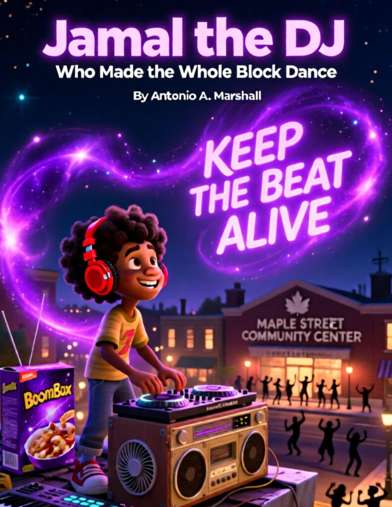 But Jamal had a secret weapon: his grandpa’s old, beat-up turntable and two scratched records that still played magic. Every afternoon Jamal set up on the cracked sidewalk.
